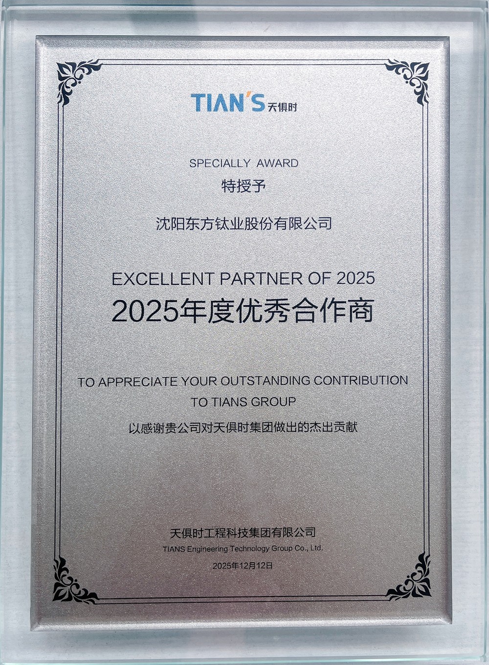 近日,2025年度天俱时供应链生态大会在石家庄成功举办。大会以“链生态 赋新质 创新程”为主题,汇聚了300余位来自精细化工、合成生物、生物医药等行业的优秀企业代表与合作伙伴。沈阳东方钛业股份有限公司作为天俱时的战略合作伙伴受邀出席,凭借严苛的质量管控体系、高效的供应链响应能力以及专业的全流程服务,再次斩获天俱时2025年度“优秀合作商”奖项,副总经理丁辉代表公司登台领奖。这一荣誉,是天俱时对供应商的最高认可,更是对双方精诚合作、共筑辉煌的最佳见证!